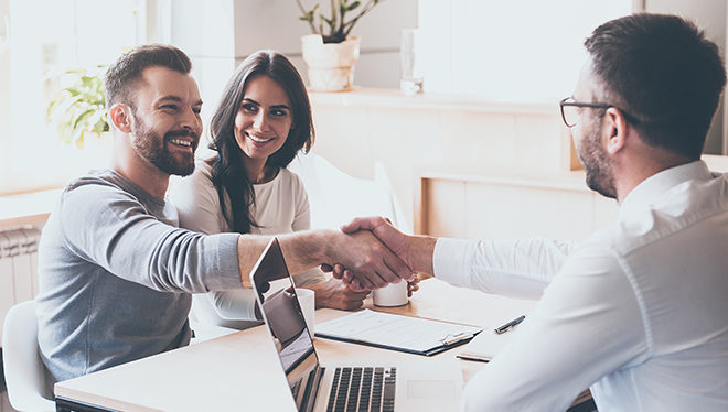 Good deal! Cheerful young man bonding to his wife while shaking hand to man sitting in front of him at the desk