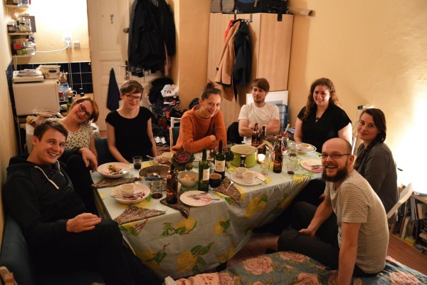 I took just a couple photos at Thanksgiving dinner last year in my tiny studio apartment, and you can see everything: the dinner table, the front door, my bed, three walls, my toaster oven (my only oven), my hot plate, and all eight of my guests, smiling and well-fed and a little inebriated. The entirety of my 195-square-foot home fits pretty neatly inside the frame (minus the bathroom, which is out in the hall across from my front door and approximately the size of the lavatory on your last flight in coach).