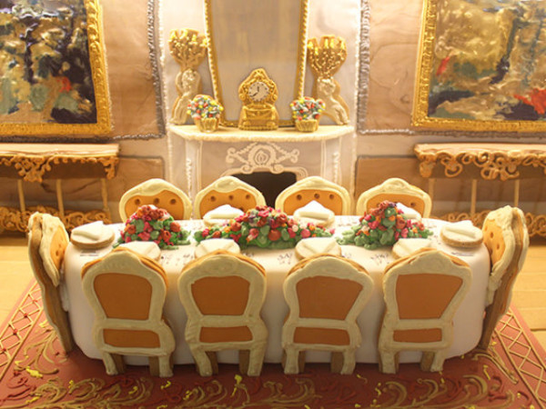 Over two metres in size, they have created the rich details of Waddesdon’s magnificent rooms, including paintings, furniture, porcelain and textiles, in edible glory. The entire project took 500 hours, 240 eggs and 216 kg of icing.