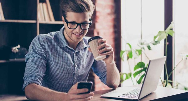 Young smiling worker drinking coffee and typing message