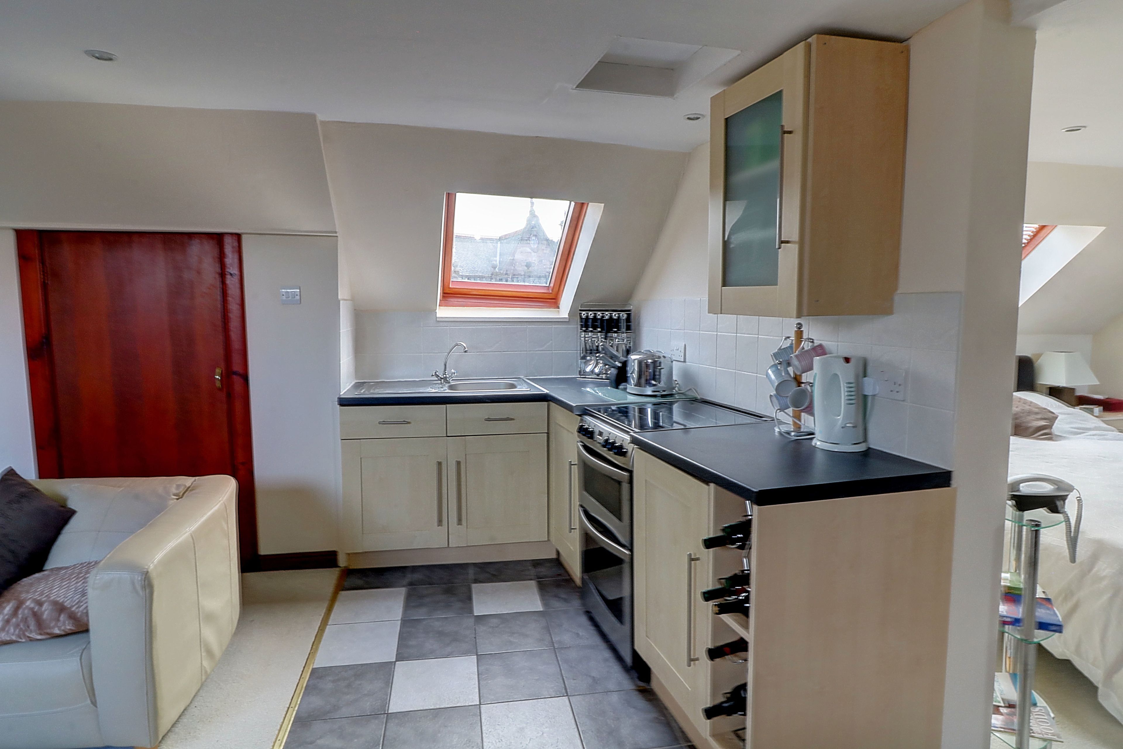 A hidden gem ? top floor 1 bedroom apartment in central forfar A great first starter home, situated in the heart of the town centre. Entering at the ground floor level there is a mutual staircase to three apartments in the block and rear access to a courtyard area where there is an external storage shed. Upstairs to the upper floor with secure entry buzzer system and a cloaks area in the entrance hallway. A door takes you into the surprisingly spacious open plan lounge with modern kitchen area offering ample space for dining as well. The lounge area is carpeted with a feature fireplace and a range of wall storage cupboards under the eaves, one storage cupboard houses the gas central heating boiler and another has plumbed space for a washing machine and space for a fridge freezer. The modern kitchen area is fitted with a range of base and wall units with coordinated work surfaces and has a free-standing electric cooker. Through to the double bedroom where there is sliding mirror fitted wardrobes providing plenty of storage for clothing items. The shower room is off the hallway and has a two-piece white suite with separate shower cubicle housing an electric shower and attractive flooring and wall tiling. The apartment benefits from double glazed Velux windows and gas central heating. Fitted flooring throughout and fresh neutral décor makes it ready to move into. Furnishings can be left as part of the sale under separate negotiations. This home would suit a single person or couple, or an investor to buy to let.